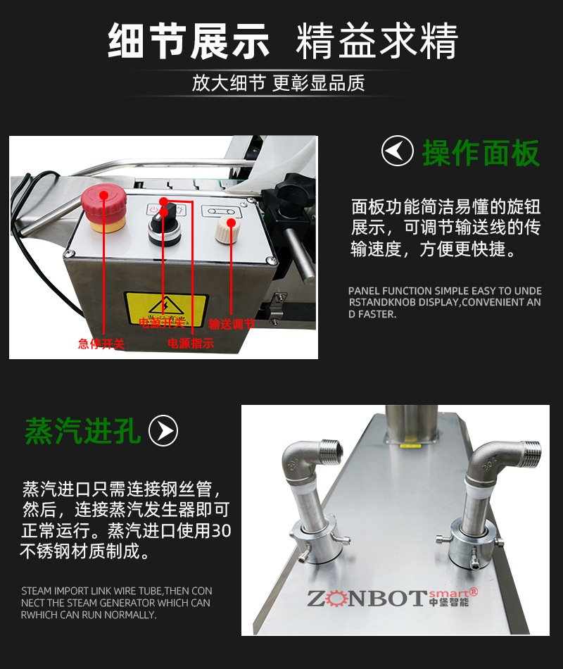 蒸汽收縮機多采用不銹鋼網材質,且為無級調速,輸送速度可任意調節,能適應不同包裝需求