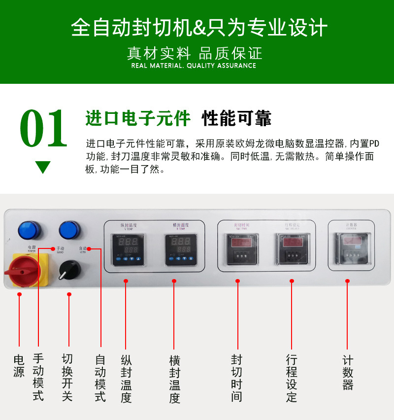 - 封切效果好:封刀采用美國杜邦特弗龍涂層抗粘耐高溫鋁合金刀,受熱均勻,不變形,封口線結實,不會開裂、焦化、冒煙,零污染,封口牢固且美觀134。
