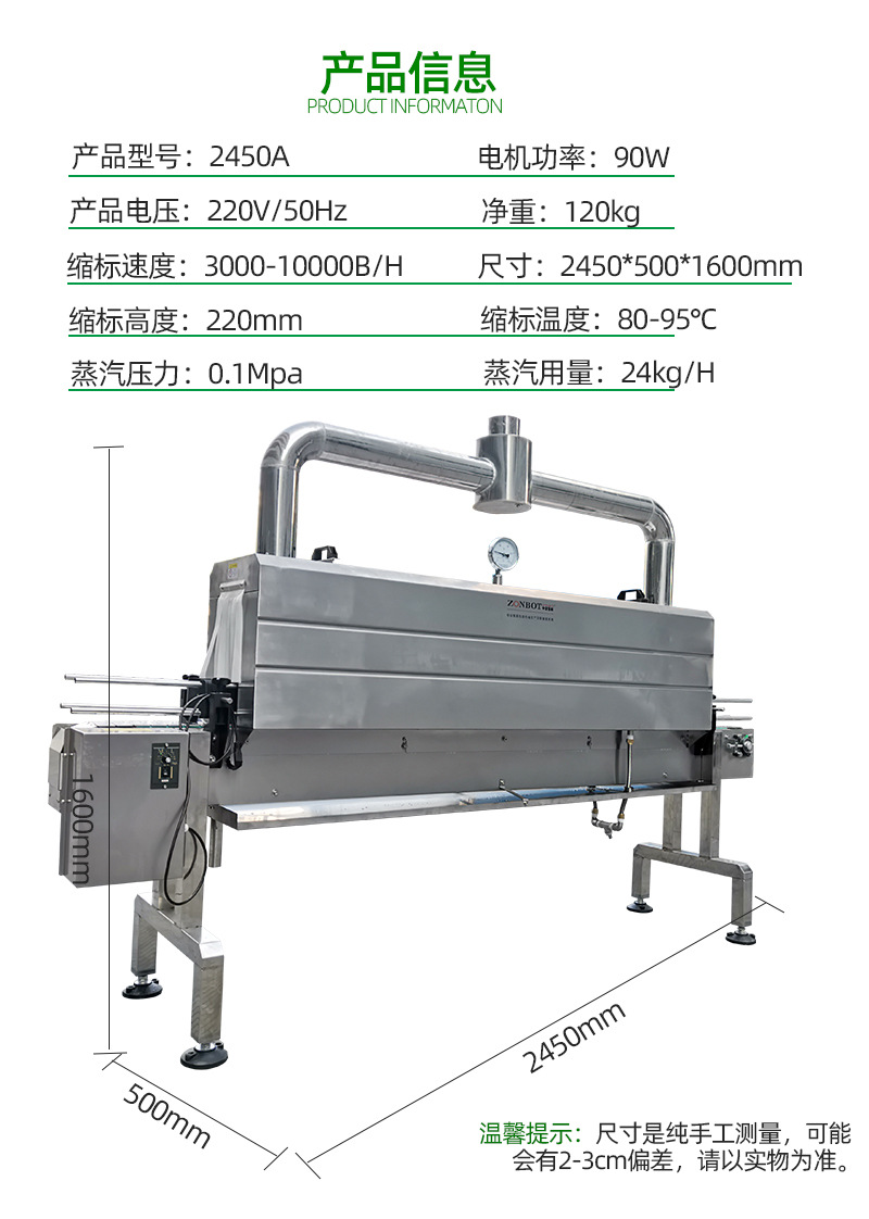 其工作流程通常是先將產(chǎn)品放入經(jīng)過預(yù)先處理的包裝材料中,然后通過輸送裝置將其送入充滿高溫蒸汽的收縮室。在蒸汽的作用下,包裝材料迅速收縮并緊密貼合在產(chǎn)品表面。