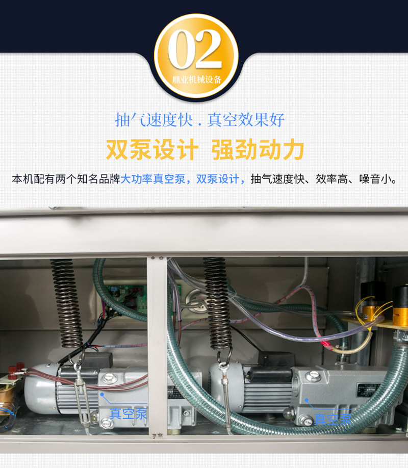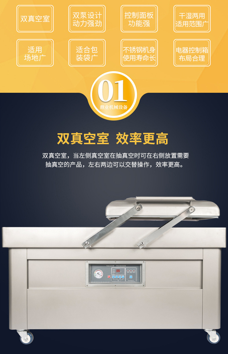 它的顯著特征是擁有兩個獨立的真空室,這兩個真空室可以交替工作,從而大大提高了包裝的效率。
