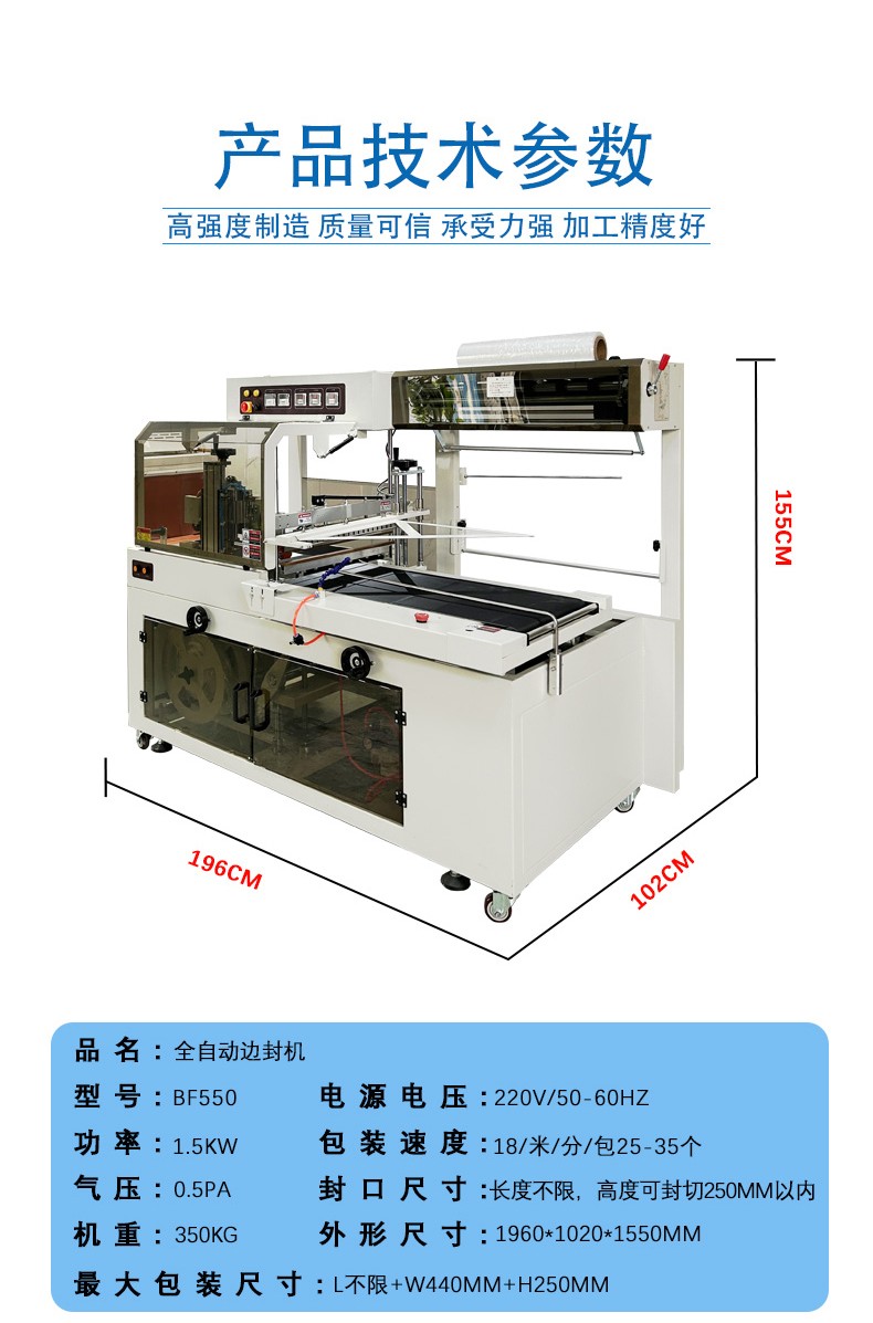 - 尺寸:如果產品尺寸較大,需要選擇能夠容納大尺寸產品的全自動邊封收縮機,包括薄膜輸送系統能夠提供足夠寬的薄膜,邊封裝置能夠對較寬的側邊進行封口,熱收縮通道也有足夠的空間讓產品通過并收縮。例如,對于大型家電產品的包裝,就需要較大型的設備,其最大包裝尺寸可能要達到長 2000mm、寬 1000mm、高 800mm 左右。