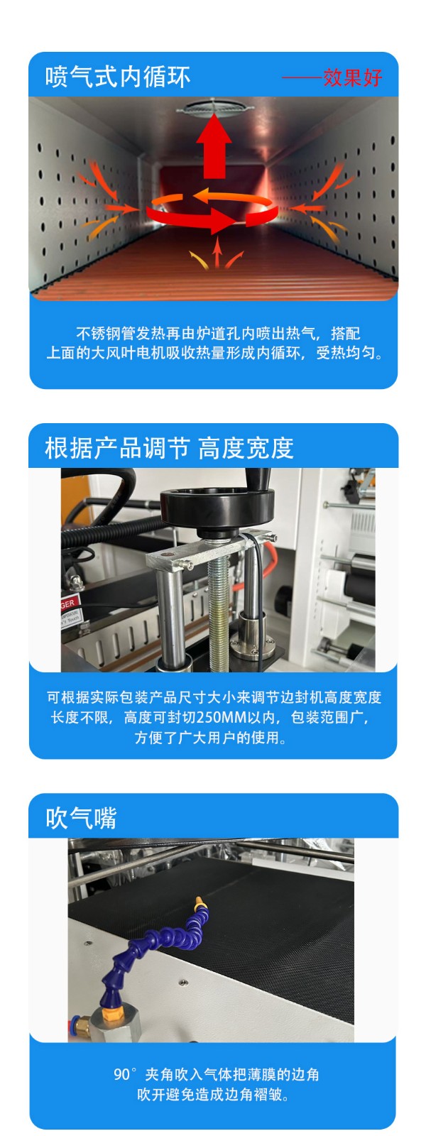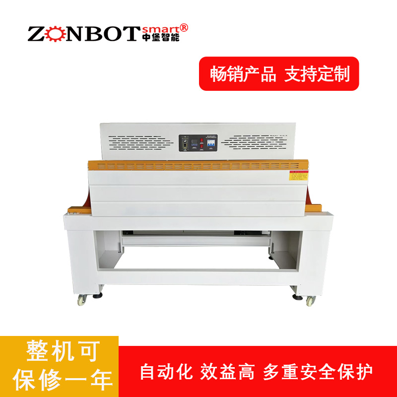 - 邊封完成后的產品被輸送到熱收縮通道。熱收縮通道內的加熱元件(如電熱管或者紅外加熱裝置)開始工作,產生大量的熱空氣。通風裝置會將熱空氣均勻地分布在通道內,使產品周圍的薄膜能夠均勻受熱。