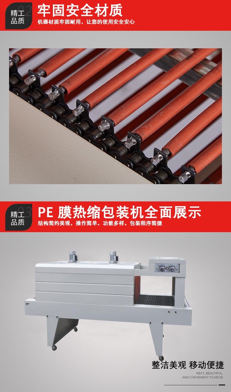 主要包括輸送帶和驅(qū)動電機(jī)。輸送帶用于承載并輸送被 PE 薄膜包裹的產(chǎn)品通過加熱區(qū)域。驅(qū)動電機(jī)控制輸送帶的速度,這個速度是可以調(diào)節(jié)的。其重要性在于確保產(chǎn)品在加熱區(qū)域停留足夠的時間,讓 PE 薄膜充分收縮。例如,如果輸送帶速度太快,PE 薄膜可能來不及完全收縮就離開了加熱區(qū)域,導(dǎo)致包裝質(zhì)量不佳;如果速度太慢,又會影響包裝效率。
