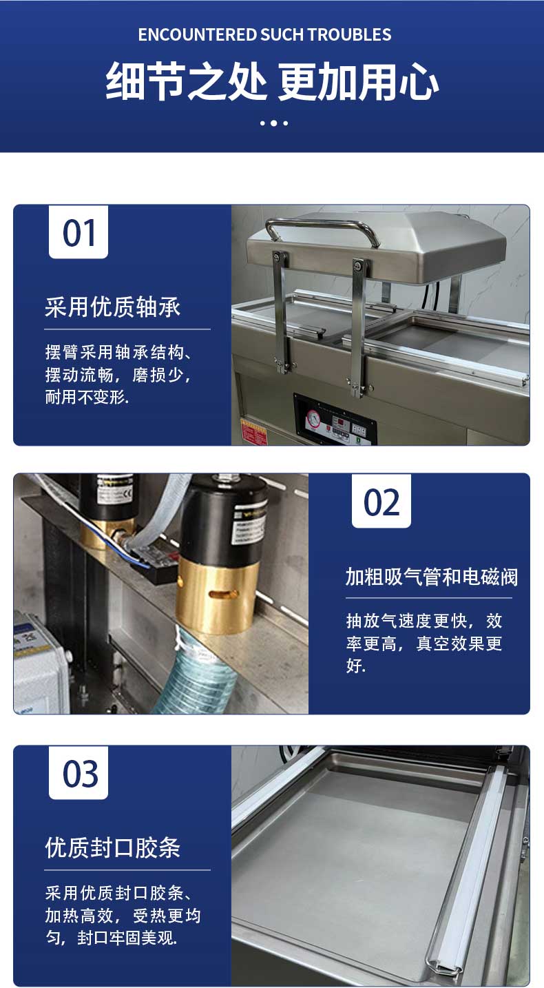 下凹式真空室深度支持定制,產(chǎn)品放置后呈傾斜狀態(tài),抽真空時(shí)湯汁牢牢鎖在凹槽內(nèi),不會(huì)流向封口處;傾斜適配的加熱條與硅膠條緊密貼合,封口平整牢固,杜絕漏封滲漏問題。雙室獨(dú)立運(yùn)行設(shè)計(jì),一個(gè)腔室抽真空封口的同時(shí),另一個(gè)腔室可同步擺放待包裝產(chǎn)品,無縫銜接無空窗期,包裝效率較單室機(jī)型提升 50% 以上。