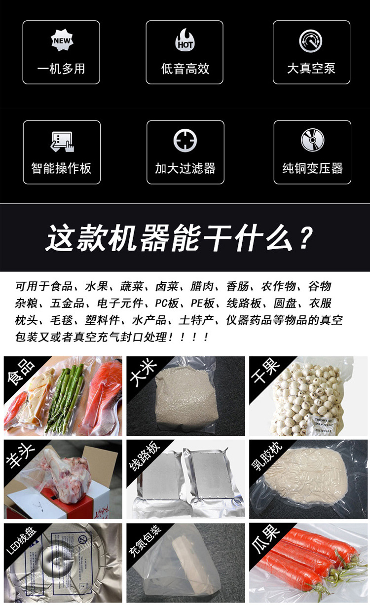 真空包裝機包括食品真空包裝機都是由真空系統、抽充氣密封系統、熱壓封合系統、電器控制系統等組成。外抽式真空包裝機是將包裝袋內抽成低真空后,當即自動封口,由于袋內真空度高,殘留空氣極少,抑制細菌等微生物的繁殖,避免了物品氧化、霉變和腐敗,同時對某些松軟的物品,經全自動真空包裝機包裝后,可縮小包裝體積,便于運輸和貯存。