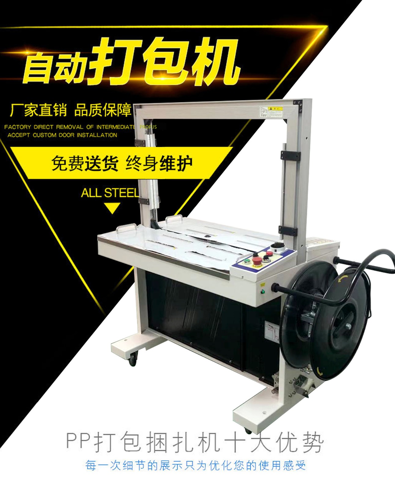 該打包機(jī)具有自動(dòng)上膠、自動(dòng)切帶、自動(dòng)封口等功能,操作簡單,維護(hù)方便。同時(shí),它還具備故障自診斷和自動(dòng)保護(hù)功能,確保在使用過程中安全可靠。