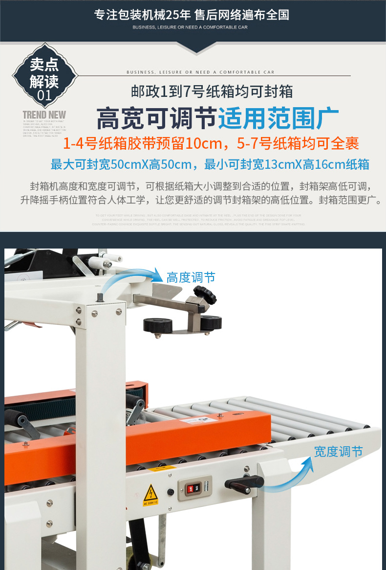 PRODUCT CENTER輕巧耐用,操作簡單;側(cè)面皮帶驅(qū)動,適用較窄紙箱;上下皮帶驅(qū)動,適用于較高紙箱;封箱機(jī)節(jié)省勞動力,減少開箱現(xiàn)象。連線使用可配套折蓋封箱機(jī),單臺使用可選用半自動封箱機(jī)。