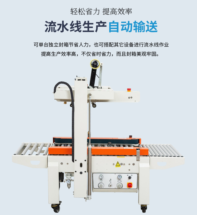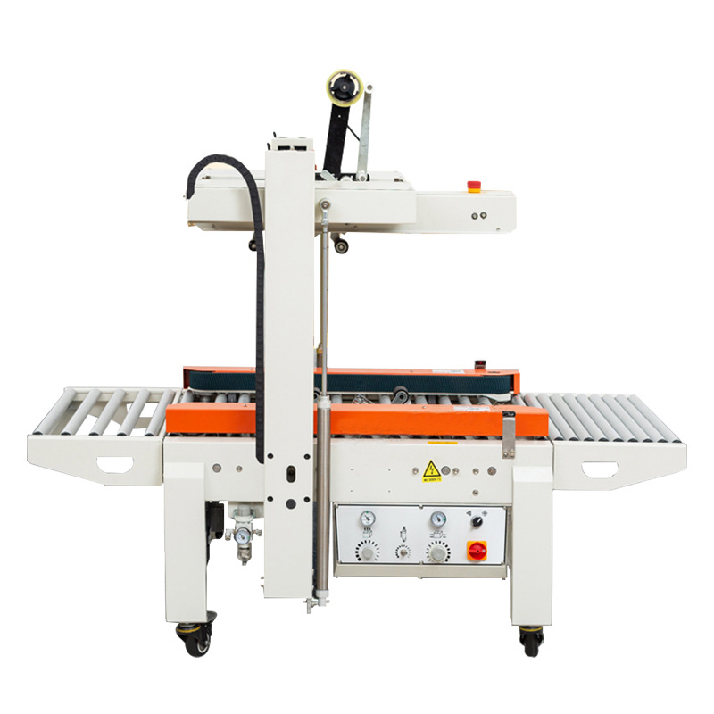 封箱機,也稱為Case sealer machine,主要用于紙箱的封箱包裝。它們不僅適用于單機作業,也可以與流水線配套使用,是包裝流水線作業中不可或缺的設備。封箱機的功能包括自動折疊、粘合和封口紙箱,通過先進的感應和控制技術,能夠自動檢測和調整紙箱尺寸,按照設計要求進行折疊和封口操作,大大提高了包裝的效率和一致性,減少了人工操作的錯誤和勞動強度。